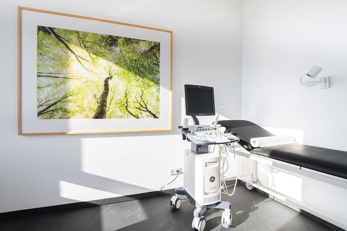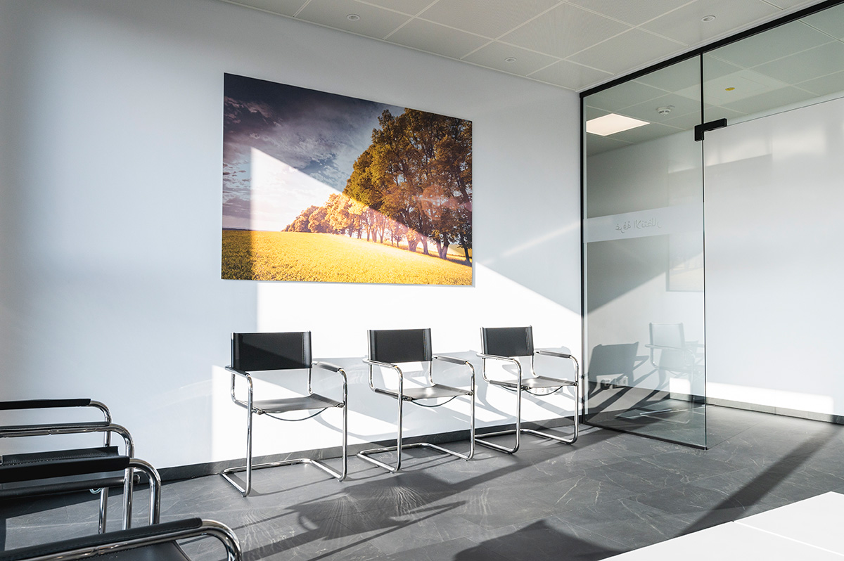 Bei einem gemeinsamen Ortstermin besprachen wir auf Basis einer Vorauswahl die gewünschten Motive. Um eine harmonische Ansicht zwischen Bild und benachbarter Wandfarbe zu erhalten, mussten einzelne Motive in ihrer Farbgebung noch etwas editiert werden. Um die Bilder insbesondere in den stark frequentierten Gängen der Praxis vor Beschädigungen zu bewahren, wurden die großformatigen Prints in den Abmessungen 1,80 x 1,20 m auf mattiertes Alu-Dibond gedruckt. In den Behandlungszimmern fanden die ausgewählten Bilder in bereits vorhandenen Holzrahmen als hochwertige Bilddrucke auf mattiertem Papier ihren Platz.